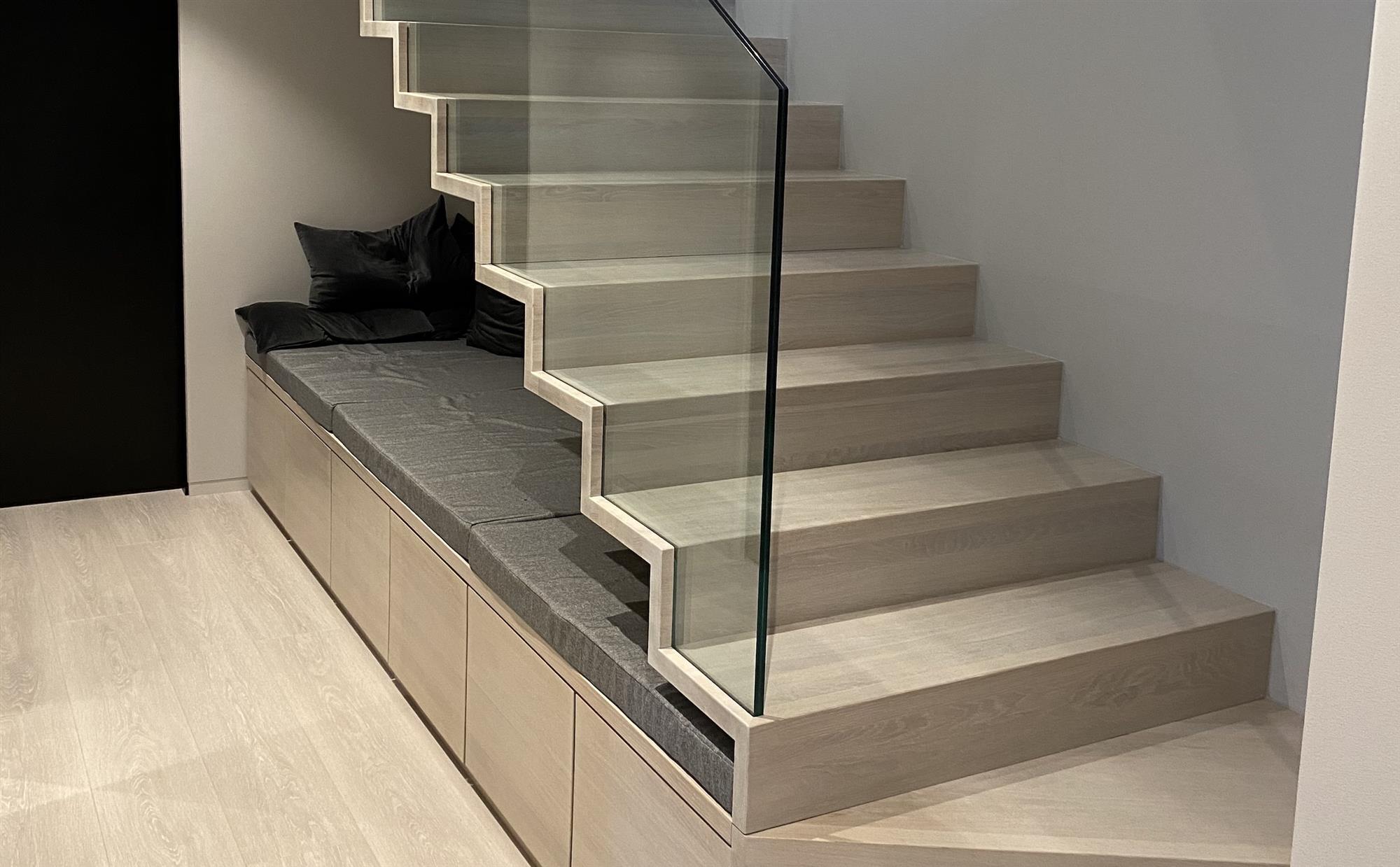 I flere prosjekter har vi for eksempel bidratt med å tenke nytt rundt rekkverk. I stedet for å velge en tradisjonell løsning med spilerekkverk for å beskytte mot fall ned i trapperommet, har vi laget oppbevaringsløsninger som også fungerer som rekkverk. På bildet under ser du et eksempel fra ett av prosjektene våre, der kunden både har fått mye oppbevaringsplass og et stilrent utseende. I dette prosjektet er det brukt hardvoksoljet eik til både trapp og møbler. Utformingen av møblene er gjort i et samarbeid med kundens interiørarkitekt, Lantz Arkitekter.