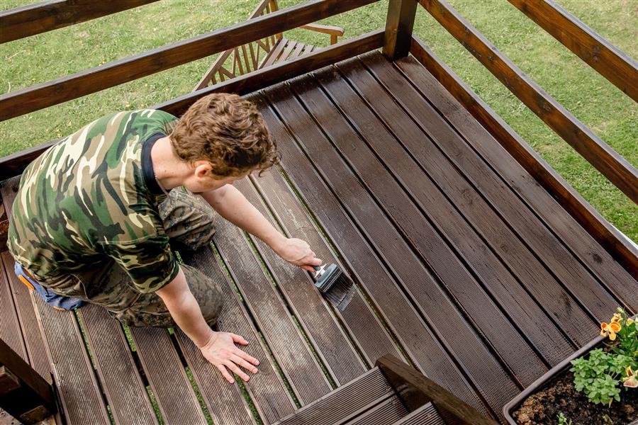Gi terrassebordene en god omgang med feiekosten, dekk til eventuelle områder i umiddelbar nærhet som ikke skal behandles, slik som rekkverk.