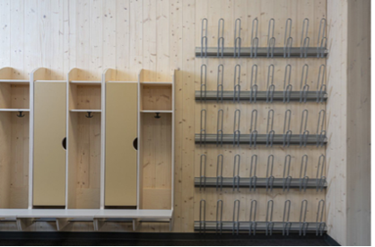 Grande Fabrikker sto for ny innredning da garderoben i Hatlelia barnehage ble levert. Her ble det brukt kryssfinér og panel i heltre, og en god dose nordisk bjørk. Den nye plassen til barna har fått smarte og barnesikre garderobekroker med produktnavn Hlín, spesielt utviklet av Grande med barna i fokus. Krokene er designet slik at de skal falle av dersom vekten blir tyngre enn vanlige klær – slik unngår man ulykker blant de små.