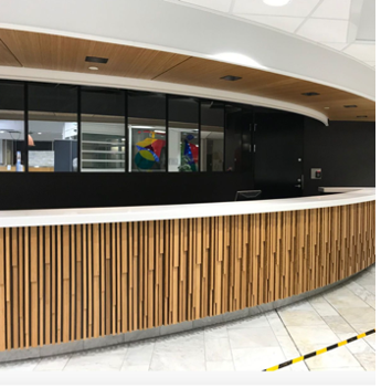 Til Haukeland sykehus har Minde Snekkeri A/S tegnet og laget en ny resepsjonsskranke til hovedinngangen. Skranken er bygget i bambus, med Corian benkeplate. Den er satt sammen av bambusspiler i fem ulike størrelser. Tilbakemeldingene tilsier at fornyet og innovativ utforming utgjør en forskjell, der inngangspartiet har blitt løftet fra det trauste og gamle, til et nytt og spennende miljø.