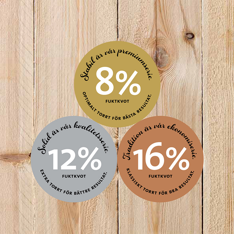 Premiumserien Stabil er den som tørkes mest. Med fuktprosent på 8 er panelet så tørt at det forblir naturlig stabilt. Dette er den fineste kvaliteten til Norrlands Trä.